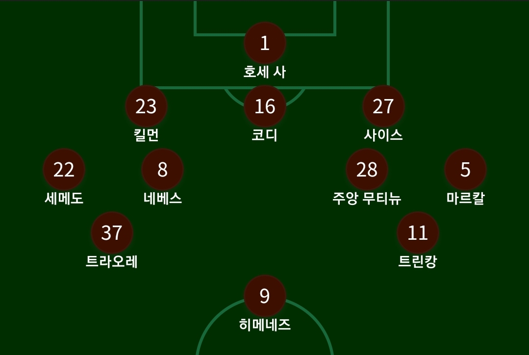 3선에는 세메두, 네베스,무티뉴 ,마르칼이 위치하였고 공격진엔 트라오레, 히메네스,트린캉이 위치하였다.